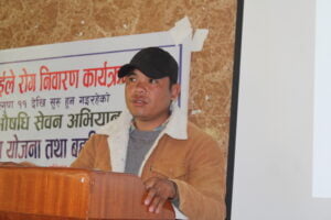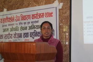 आयोजित कार्यक्रममा वोल्दै जिल्ला जनस्वास्थ्य कार्यलय बागलुङका जनस्वास्थ्य निरिक्षक लक्ष्मि सर्माले वोल्दै यस पटकको अभियानबाट बागलुङमा हात्तिपाईले रोग निवारण हुने गरि सबै निकायको सक्रियतामा अगाडी बद्नुपर्ने बताउँदै कसैले निरन्तर औषधि प्रयोग गर्ने र कसैले प्रयोग नगर्ने प्रवृर्तिका कारण हात्तिपाईले रोग निवारण हुन नसकेको प्रस्ट पार्नु भयो ।