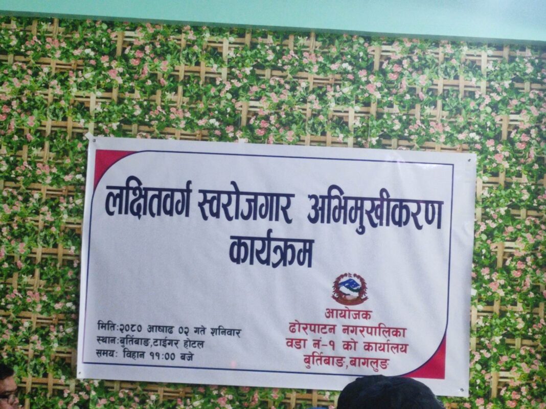 ढोरपाटन नगरपालिका १ को आयोजनामा शनिवार बुर्तिबाङमा टोल विकास संस्थाका पधादिकारी र लक्षित वर्गका विचमा सचेतना मुलक कार्यक्रम सम्पन्न भएको छ ।