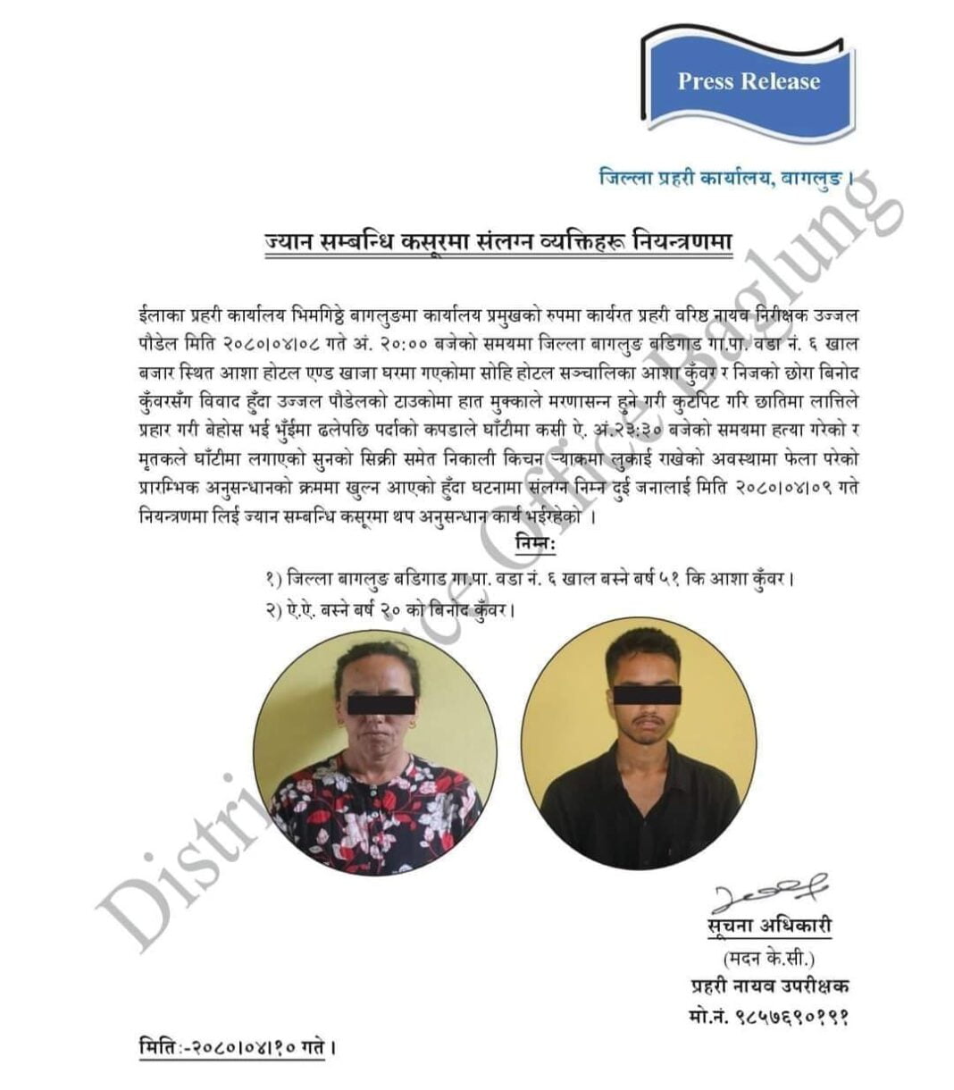 होटल सञ्चालक ५१ बर्षिय आशा कुवँर र २० बर्षिय छोरा विनोद कुवँरलाई ज्यान सम्वन्धी कसुरमा थप अनुसन्धान भइरहेको प्रहरीले जनाएको छ । मृतक पौडेलको घर पर्वत रहेको र निजका एक छोरी र श्रीमती रहेको पाइएको छ ।