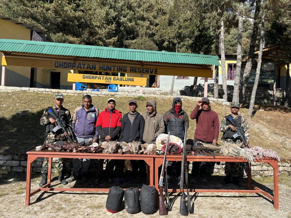 ढोरपाटन शिकार आरक्ष कार्यालयका बरिष्ठ संरक्षण अधिकृत बीरेन्द्र प्रसाद कंडेलको कमाण्डमा खटिएको संयुक्त टोलीले कोभर्ट पट्रोलको क्रममा म्याग्दीको धौलागिरी गाउँपालिकाका ५२ वर्षीय प्रेम बहादुर छन्त्याल, सोहि स्थानका ५० वर्षीय पहलमान छन्त्याल र २८ वर्षीय सुमन छन्त्याललाई पक्राउ गरेको छ । सेनाको देवीबक्स  गुल्मको सुरक्षा पोस्ट गुर्जाघाट मान बहादुर ऐर सहितको ४ जना नेपाली शेनाको टोली र ४ जना सिकार आरक्षको संयूक्त टोलीले प्रकाउ गर्न सफल भएको हो ।