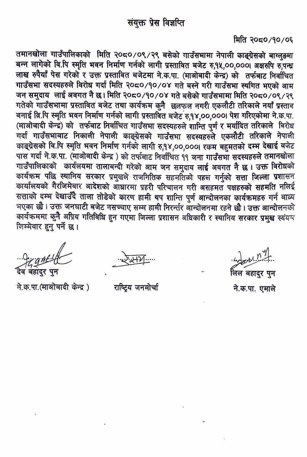 विज्ञप्तीमा लेखिए अनुसार ‘विरोधको कार्यक्रमपछि स्थानीय सरकार प्रमुखले राजनीतिक सहमतिको पहल गर्नुको सट्टा जिल्ला प्रशासन कार्यालयको गैरजिम्मेवारी आदेशको आधारमा प्रहरी परिचालन गरी ताला तोडेको कारण हामी थप शान्तिपूर्ण आन्दोलनका कार्यक्रमहरु गर्न बाध्य भएका छौं, ’ संयुक्त प्रेस विज्ञप्तिमा भनिएको छ , ‘बजेट नसच्चाएसम्म हामी निरन्तर आन्दोलनमा रहनेछौं । उक्त आन्दोनलको कार्यक्रममा कुनै अप्रिय गतिविधि हुन गएमा जिल्ला प्रशासन र स्थानीय सरकार प्रमुख स्वयम जिम्मेवार हुनपर्नेछ ।’