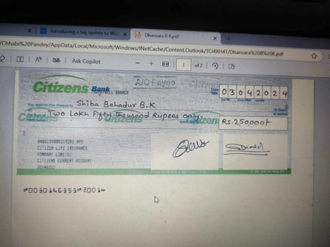 सिटिजन लाईफ इन्स्योरेन्स कम्पनी बुर्तिबाङ शाखा द्धारा स्वर्गीय धनसरा बिकको परिवारलाई बीमा दावी भुक्तानी बापतको रकम हस्तान्तरण गरिएको छ ।