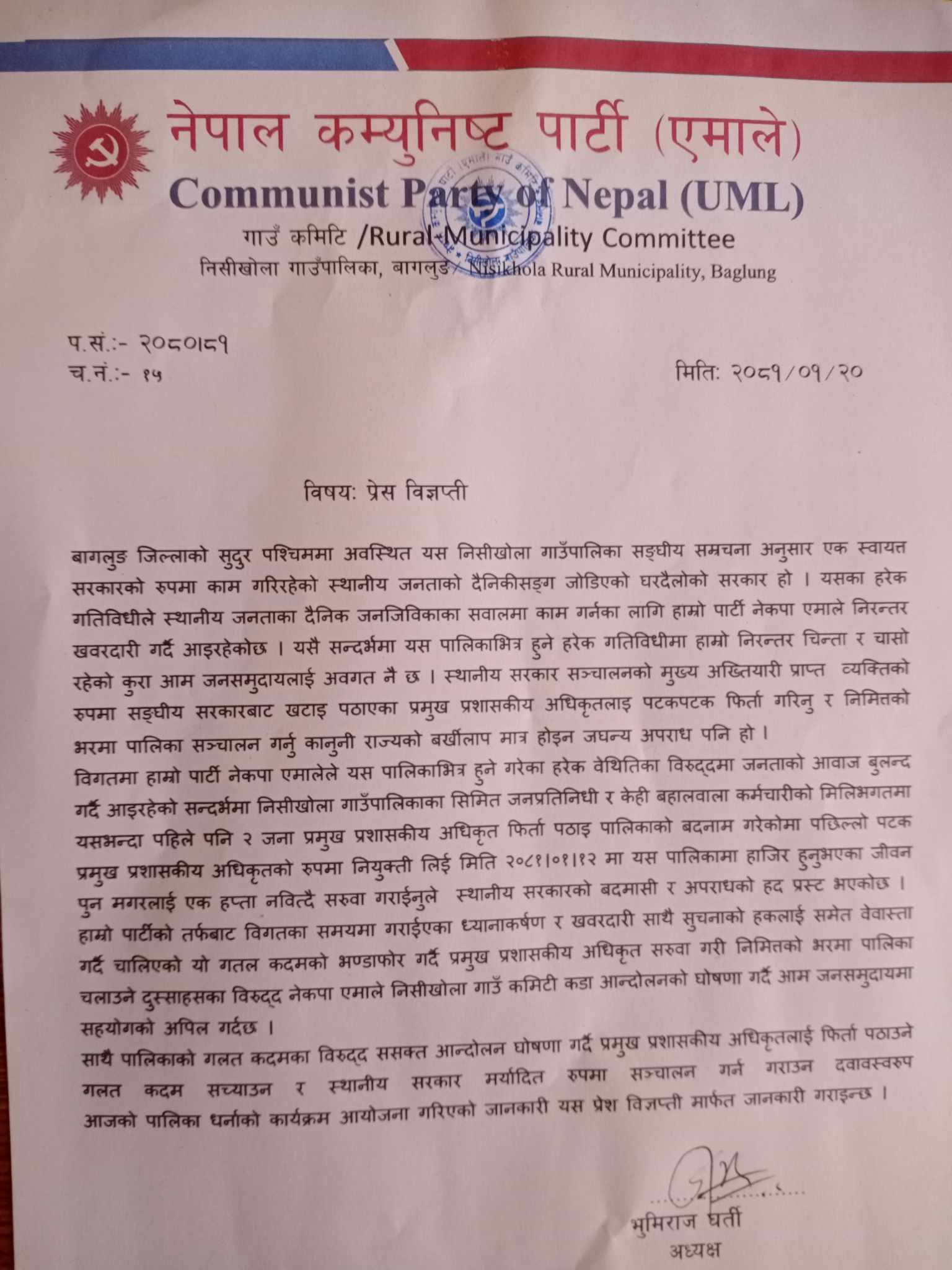 यसै सन्दर्भमा नेकपा एमाले निसीखोला गाउँ कमिटीले गाउँपालिका कार्यालयमा तालाबन्दी गर्दे यस्ता गलत कृयाकलाप रोक्न पालिका कार्यालयमा तालाबन्दी गर्दे गाउँपालिकाको गलत कदमका विरुद्ध सशक्त आन्दोलन घोषणा गर्दे प्रमुख प्रशासकीय अधिकृतलाई फिर्ता पठाउने कदम सच्चाउन र स्थानीय सरकार मर्यादित रुपमा सञ्चालन गर्न दबाब स्वरुप धर्ना कार्यक्रमको आयोजना गरिएको नेकपा एमाले निसीखोला गाउँ कमिटी अध्यक्ष भूमिराज घर्तीद्वारा हस्ताक्षरित विज्ञप्तिमा उल्लेख छ ।