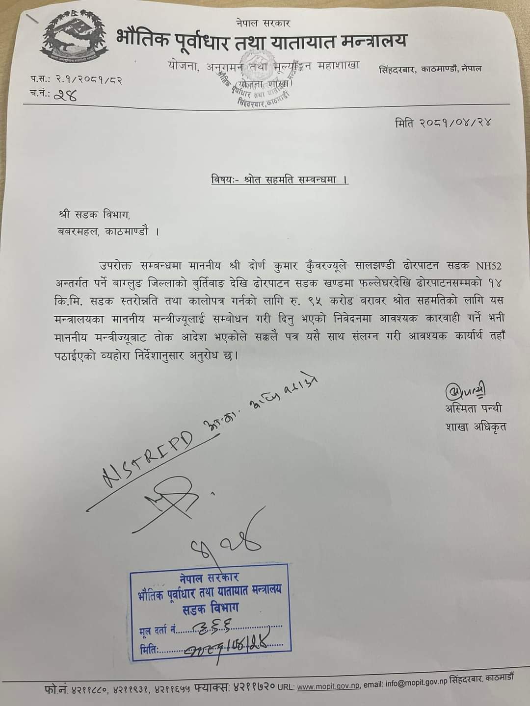 उकालो र अति जोखिम रहेको उक्त क्षेत्रमा सडक स्तरोन्नति र कालोपत्रे गर्नका निम्ती भौतिक पूर्वाधार तथा यातायात मन्त्रालय सिंहदरबार काठमाण्डौमा अनुमानित ९५ करोड लागतको श्रोत सहमति प्रदानका निम्ती अनुरोध गर्नुभएको हो ।