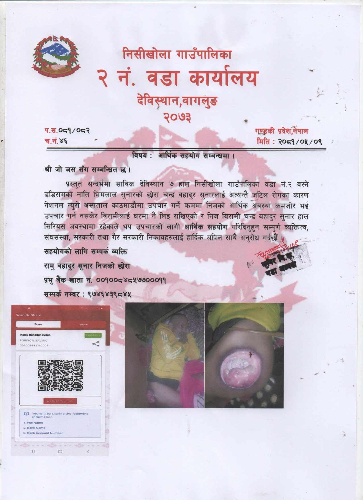 निसीखोला गाउँपालिका वडा नम्बर २ ले समेत आर्थिक सहयोग गरिदिन सबैसंग अपिल गरेको छ । स्थानीय युवराज सिर्पाली लगाएत युवाहरुको सक्रियतामा चन्द्र सुनार बचाऔँ अभियान सञ्चालन गरेर आर्थिक संकलन सुरु गरिएको हो । सहयोग गर्न चाहाने दाताले क्युआर र निम्न मोवाईल नम्बरमा सम्पर्क गरेर सहयोग गर्न सक्ने परिवारले जनाएको छ । ९७४६४३९८४५ रामु बहादुर सुनार