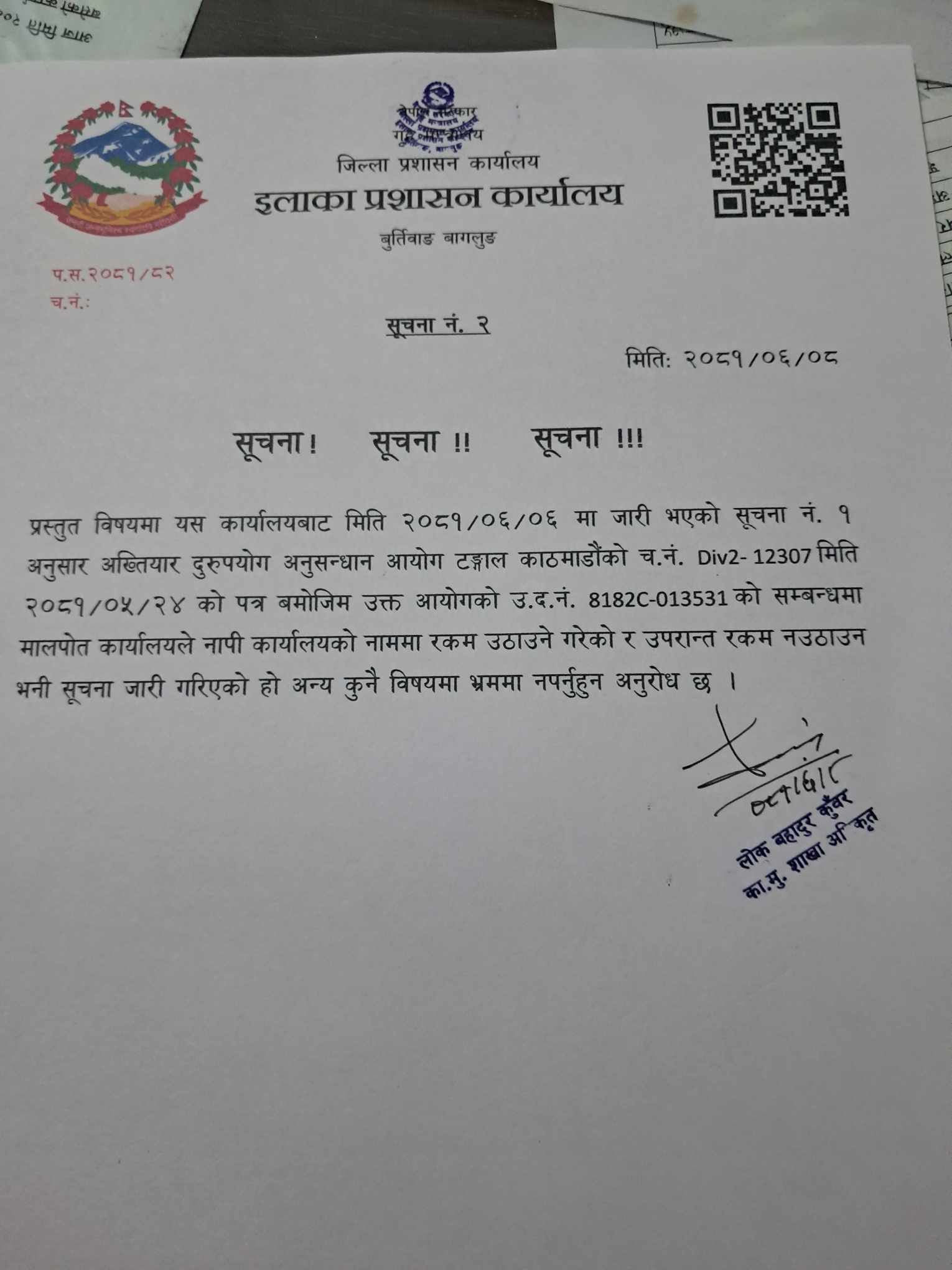 सूचना अनुसार अख्तियार दुरुपयोग अनुसन्धान आयोग टङ्गाल काठमाडौँको चलानी नम्बर १२३०७ को गत भाद्र २४ गतेको पत्रमाथि उल्लेखित विवरण सहितको पत्र पठाएको तर सरकारी जग्गा खरिदको विषयमा उक्त पत्रको आशय नरहेको इलाका प्रशासन कार्यालय बुर्तिबाङका प्रमुख लोक बहादुर कुवँरको भनाई छ ।