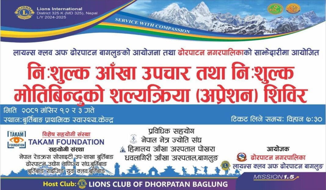 लायन्स क्लब अफ ढोरपाटनको आयोजना  र ढोरपाटन नगरपालिकाको साझेदारीमा मंसिर १ गतेदेखि ३ गते सम्म बुर्तिबाङ प्राथमिक स्वास्थ्य केन्द्रमा निः शुल्क आँखाको चेकजाँच उपचार तथा मोतिविन्दुको शल्यक्रिया अप्रेसन शिविर हुने भएको छ ।