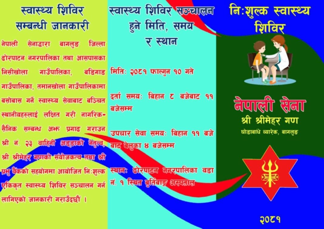 पश्चिम बागलुङका ४ वटा पालिकामा रहेका स्वास्थ्य सेवाबाट बञ्चित नागरिकलाई लक्षित गर्दे शिविर आयोजना गर्न लागिएको नेपाली सेनाले जनाएको छ ।