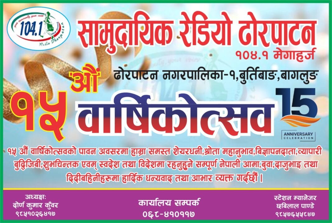 बागलुङ जिल्लाको ढोरपाटन नगरपालिका १ बुर्तिबाङबाट प्रसारण हुँदै आएको सामुदायिक रेडियो ढोरपाटन १०४.१ मेगाहर्ज १४ वर्ष पुरा भई बैशाख ११ गतेदेखि १५ औँ वर्षमा प्रवेश गरेको छ ।