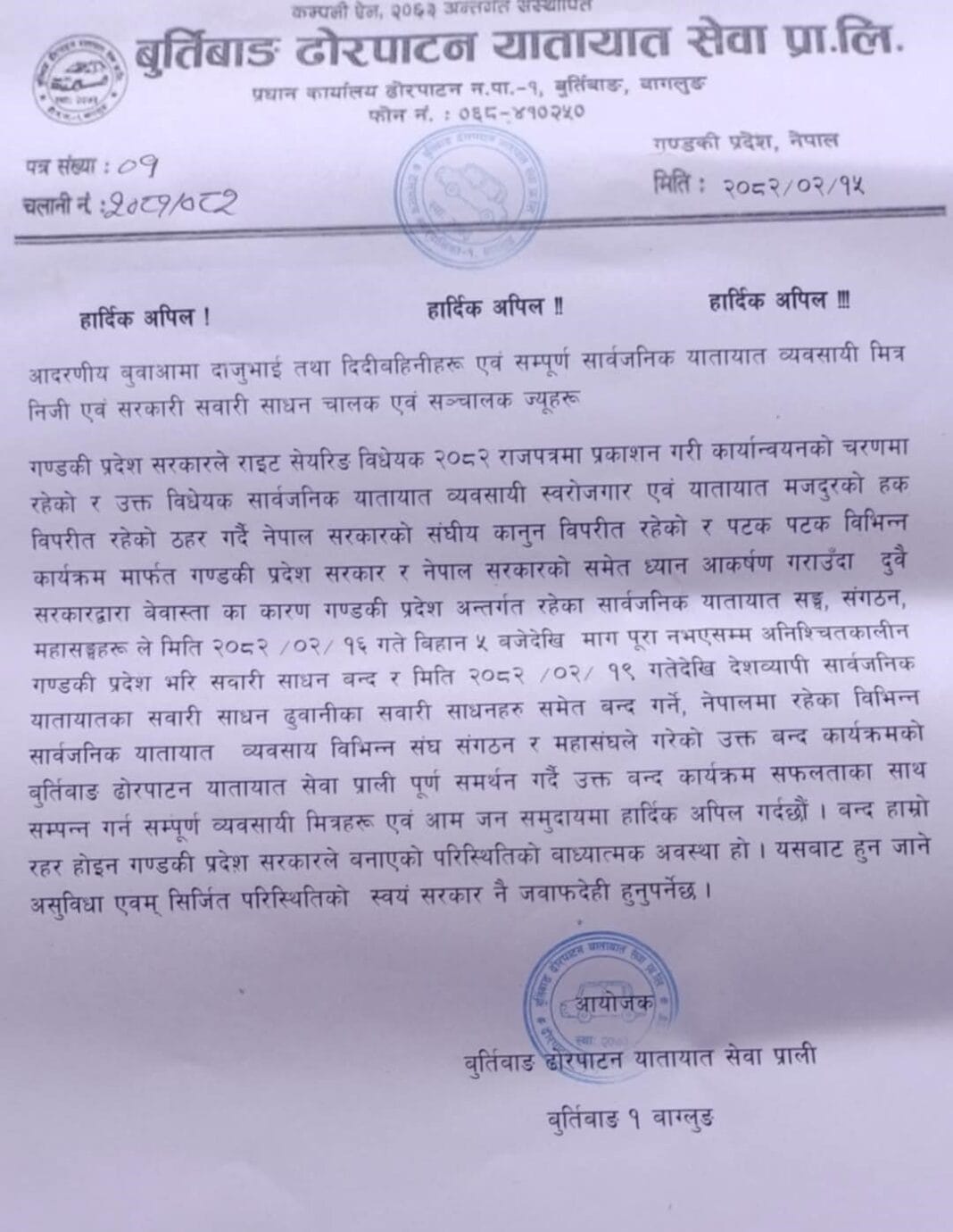 गण्डकी प्रदेश सरकारले जारीको गरेको ‘राइड सेयरिङ र सेल्फ ड्राइभ’ सेवालाई कानूनी रूपमा स्वीकृति दिने नियमन तथा व्यवस्थापनसम्बन्धी नियमावली खारेज गनुपर्ने मागसहित गरिएको सार्वजनिक गाडी बन्दका कारण आज सर्वसाधारणको आवतजावतमा कठिनाइ भएको छ ।