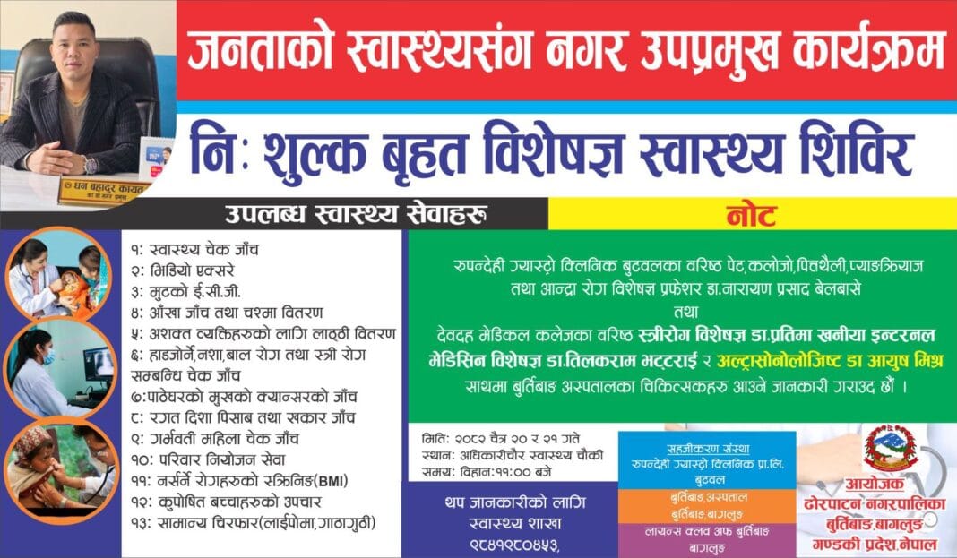 ढोरपाटन नगरपालिकाको आयोजनामा भोलीदेखि दुई दिने निःशुल्क स्वास्थ्य शिविर हुने भएको छ ।